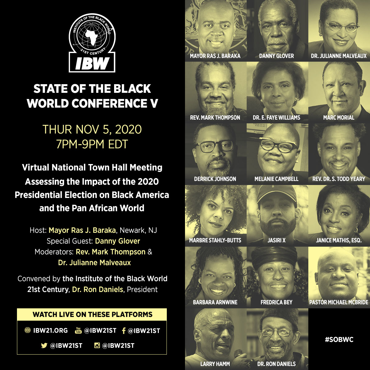 Dr. Ron Daniels, President of IBW said, “while we are postponing State of the Black World Conference V until after it can safely be convened as an in-person event, the unprecedented nature of this presidential election dictated that IBW provide a venue for Black leaders to share their analysis of what the outcome of the election will mean for the future of Black people in this country and around the world”